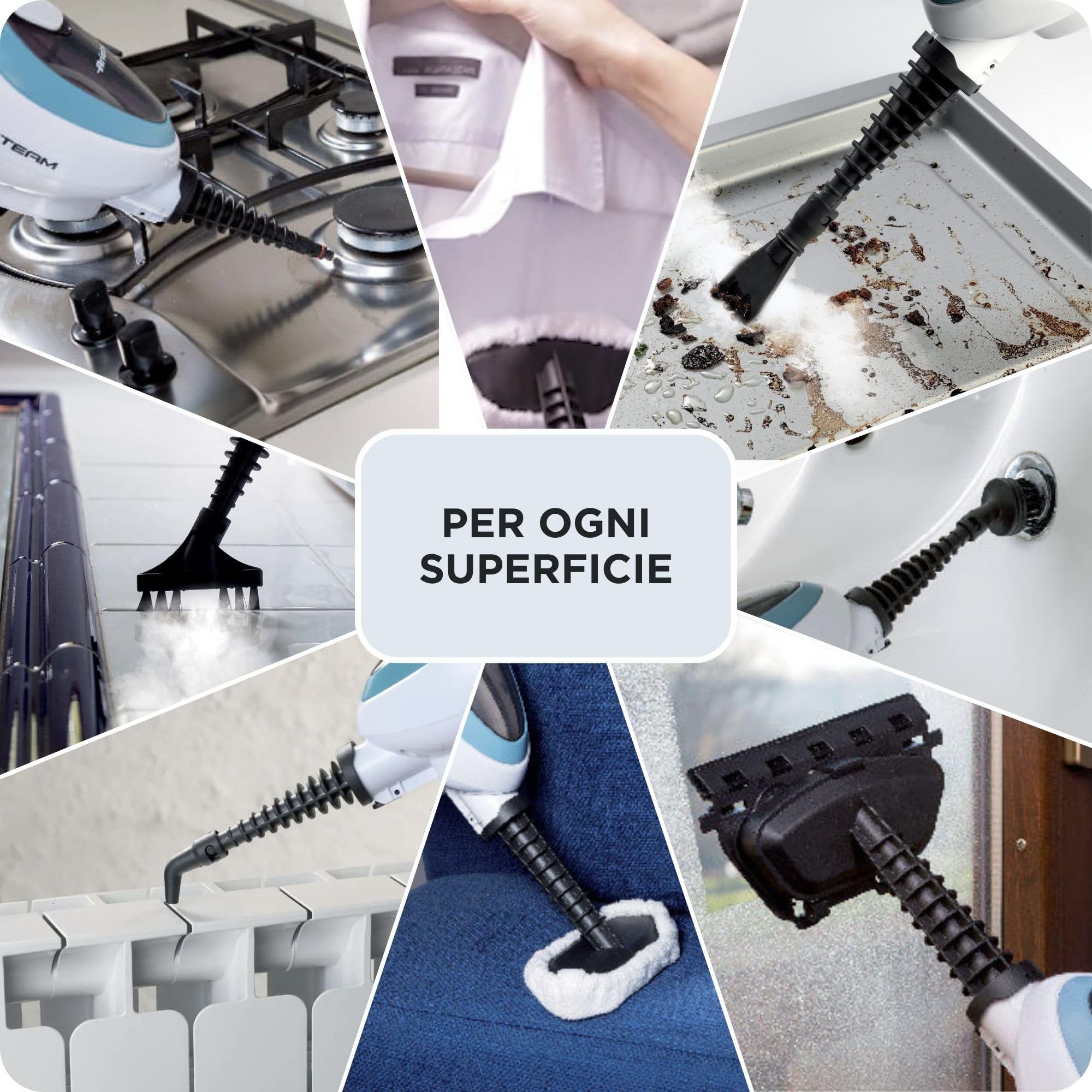 Парочистачката е снабдена с богат комплект аксесоари, които позволяват почистване на подове, килими, фуги, баня, кухня, тапицерии, прозорци, радиатори и труднодостъпни места. Един уред заменя множество почистващи устройства.