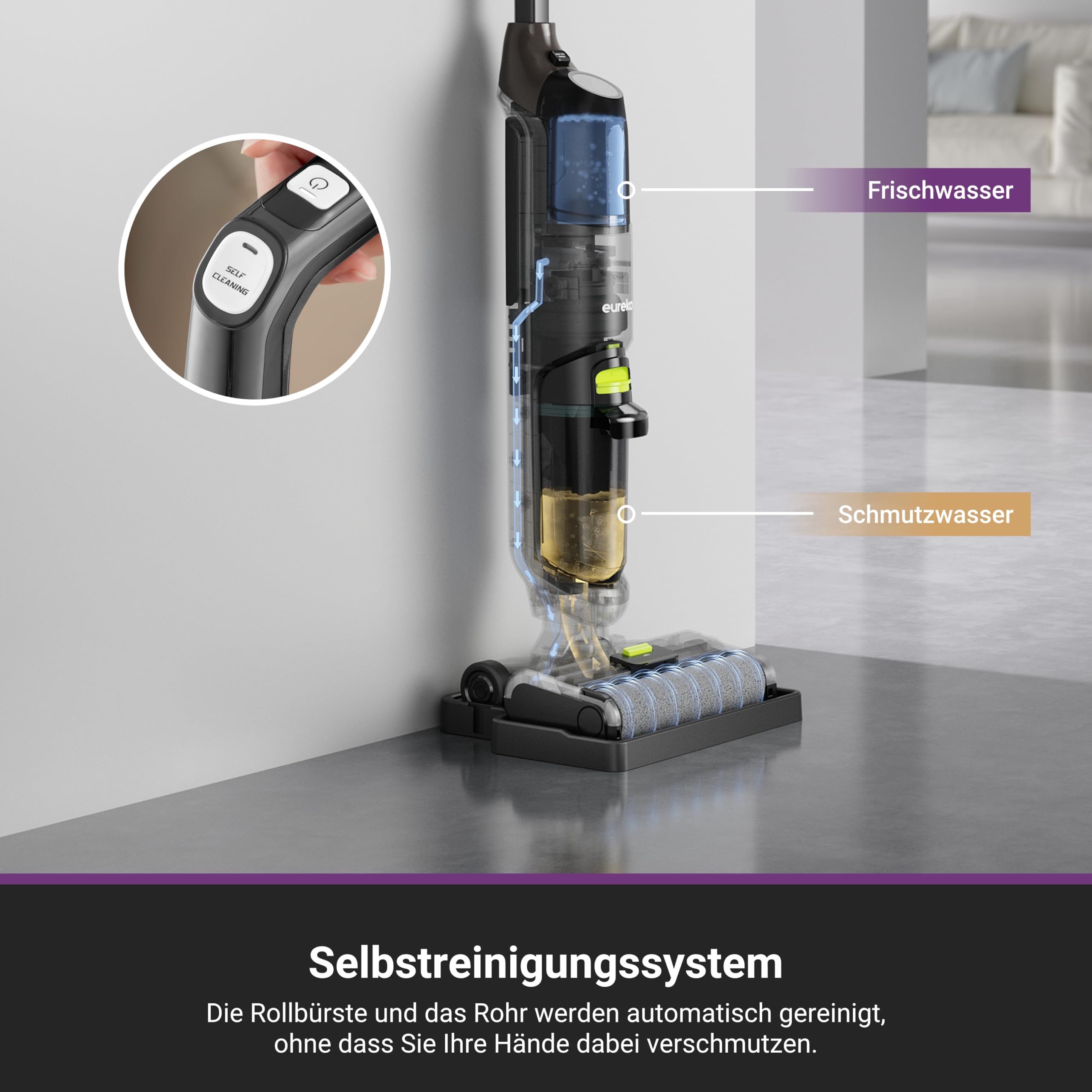 С вградения цикъл за самопочистване ролковата четка се измива автоматично за няколко секунди. Това спестява време и предотвратява натрупването на замърсявания по ролката.