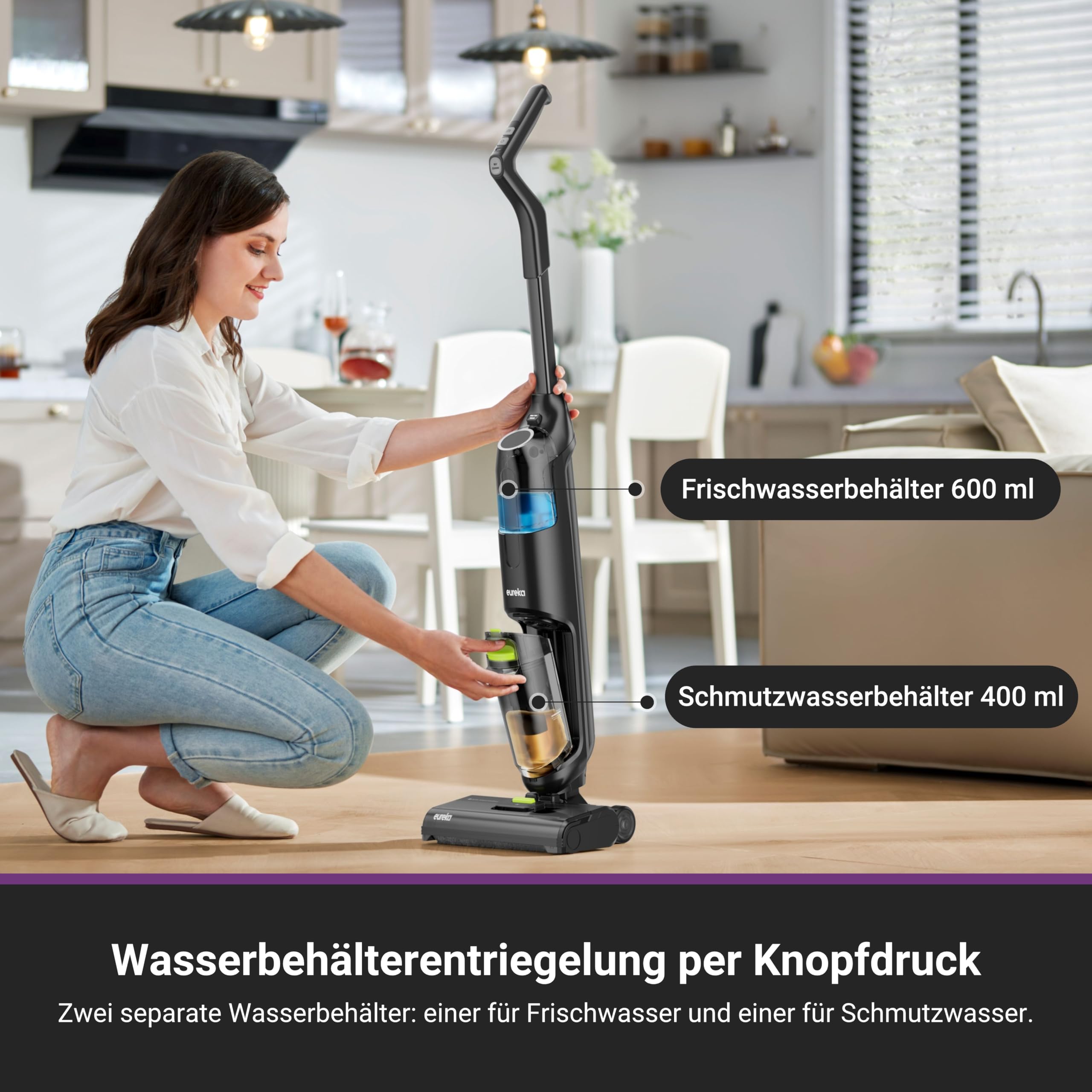 EUREKA NEW400 комбинира прахосмукване, миене и избърсване в един уред. Благодарение на пръскане, четкане, търкане и ефективно събиране на мръсната вода, над 90% от замърсяванията се отстраняват, а подовете изсъхват бързо и без петна.