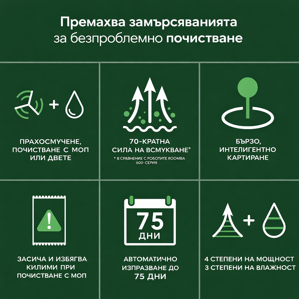 Роботът разполага с до 70 пъти по-силно засмукване спрямо серията Roomba 600, което го прави ефективен за:
