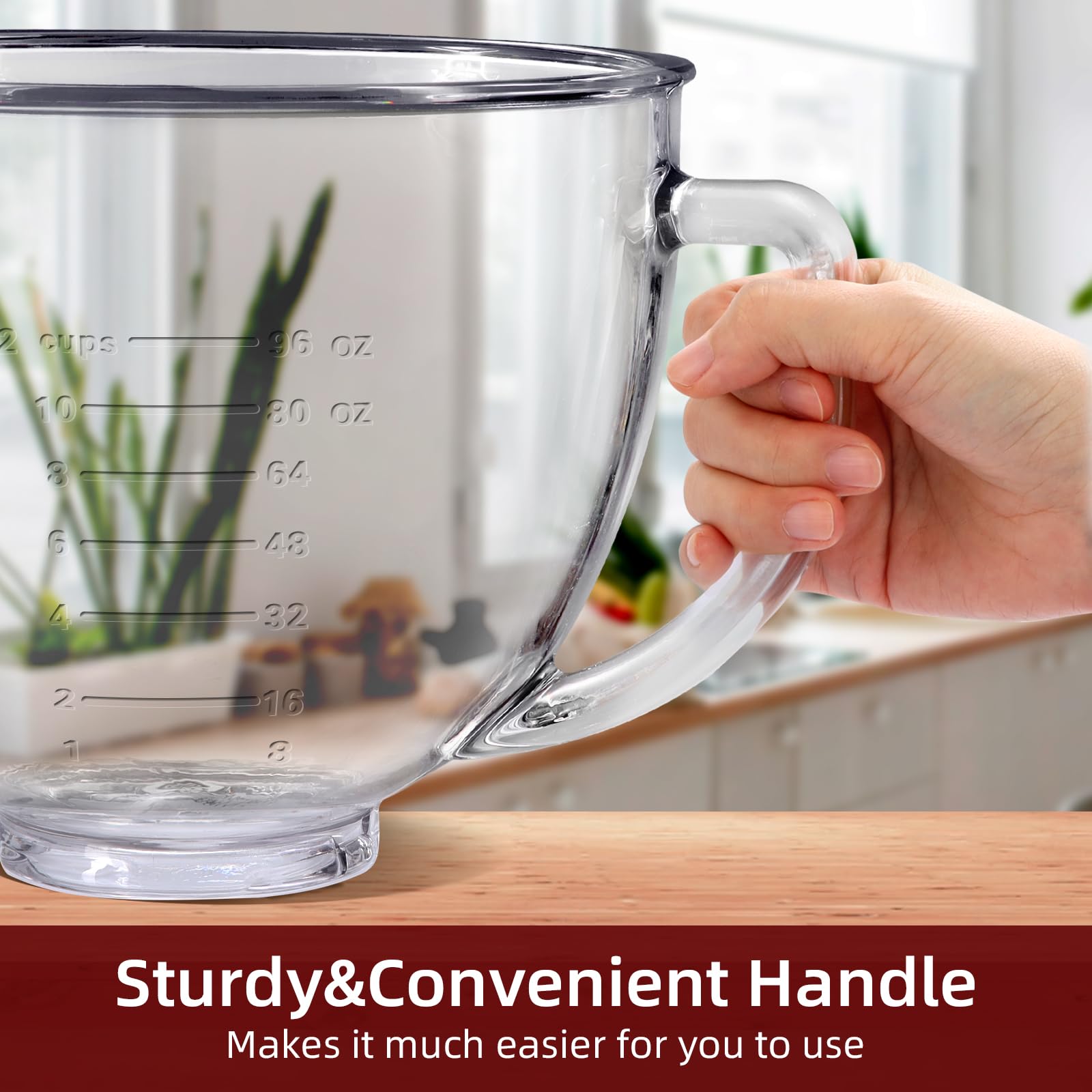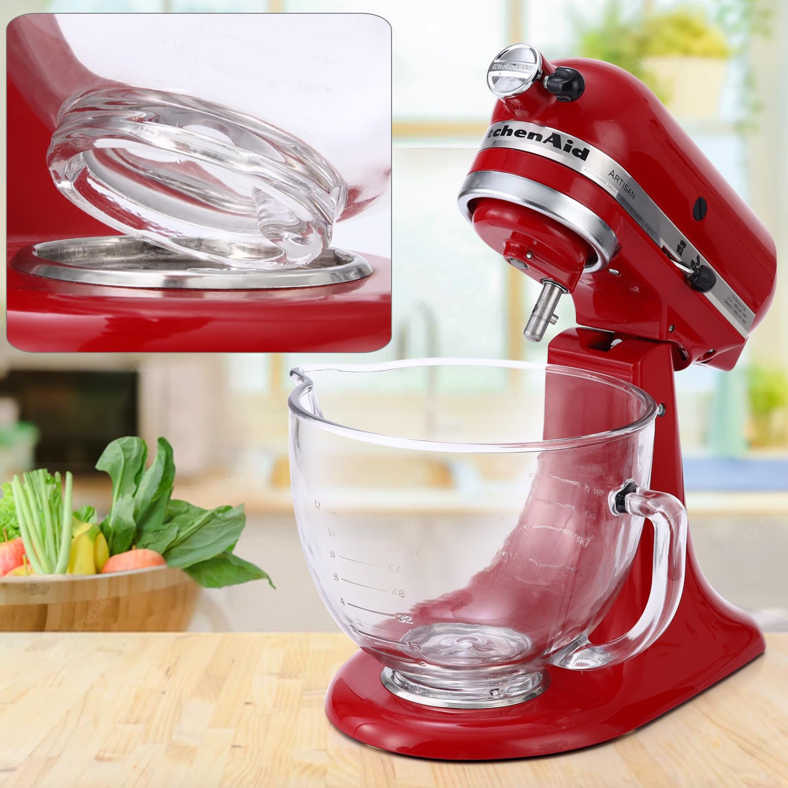 Това е стъклена купа с капак за KitchenAid миксер, с капацитет 4.8 литра, съвместима с модели с накланяща се глава (tilt-head).